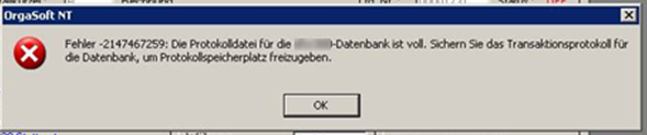 Was kann ich machen, wenn in Orgasoft eine Meldung erscheint "Das Transaktionsprotokoll der <Datenbankname>-Datenbank ist voll. Sichern Sie das Transaktionsprotokoll für die Datenbank, um Protokollspeicherplatz freizugeben"