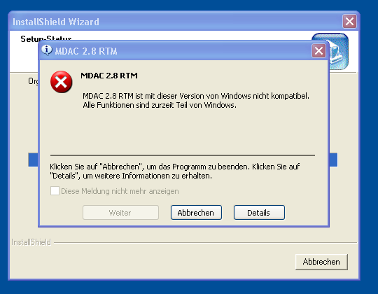 Beim Setup erhalte ich eine Fehlermeldung, dass MDAC 2.8 RTM nicht mit der Windows-Version kompatibel sei. Wie kann man dies beheben?
