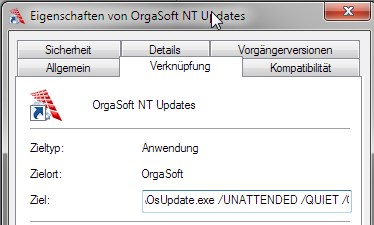 Damit OsUpdate im Hintergrund ausgeführt wird, also eine unbeaufsichtigte Installation von Updates möglich ist, kann man in den Eigenschaften der Autostart-Verknüpfung oder in einer manuell erstellten Verknüpfung, die Start-Parameter /QUIET /UNATTENDED eintragen -also z.B: "O:\Orgasoft\OsUpdate.exe" /QUIET /UNATTENDED.
