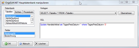 Steht Ihnen auf Ihrem Rechner kein Managementstudio zur Verfügung, so können Sie in Orgasoft über "Hilfe/Info" das Informationsfenster öffnen, dort drücken Sie "STRG+Shift+1", in das nun geöffnete Fenster kopieren Sie das SQL-Statement und bestätigen dies mit Klick auf "OK".