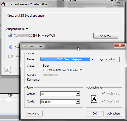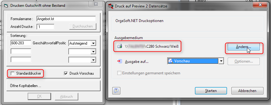 Nach dem Klick auf „Ändern“ erhält man ein Fenster mit Auswahl der Drucker-Einstellung und wählt den korrekten Drucker: