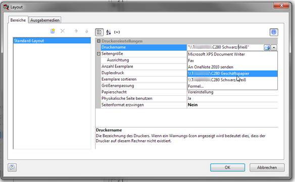 Und dann im Layout-Fenster den richtigen Drucker auswählen und das Formular anschließend speichern:
