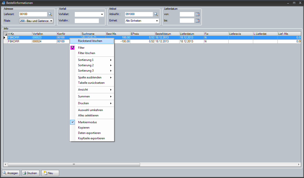 Wenn die Menge "reserv. für Filiale" in Bestands-Filialübersicht durch eine noch offner Filialbedarfsmeldung gesetzt wurden, so kann man in der „Bestellinformation“ den betreffenden Artikel und Vorfall aufrufen, dann über die rechte Maustaste „Rückstand löschen“ wählen, wie in der Abbildung unten, so dass die Werte auf null gesetzt werden. Hier werden sowohl die Bestellt- als auch die „reserviert für Filiale“-Werte um die entsprechende Menge zurückgesetzt.