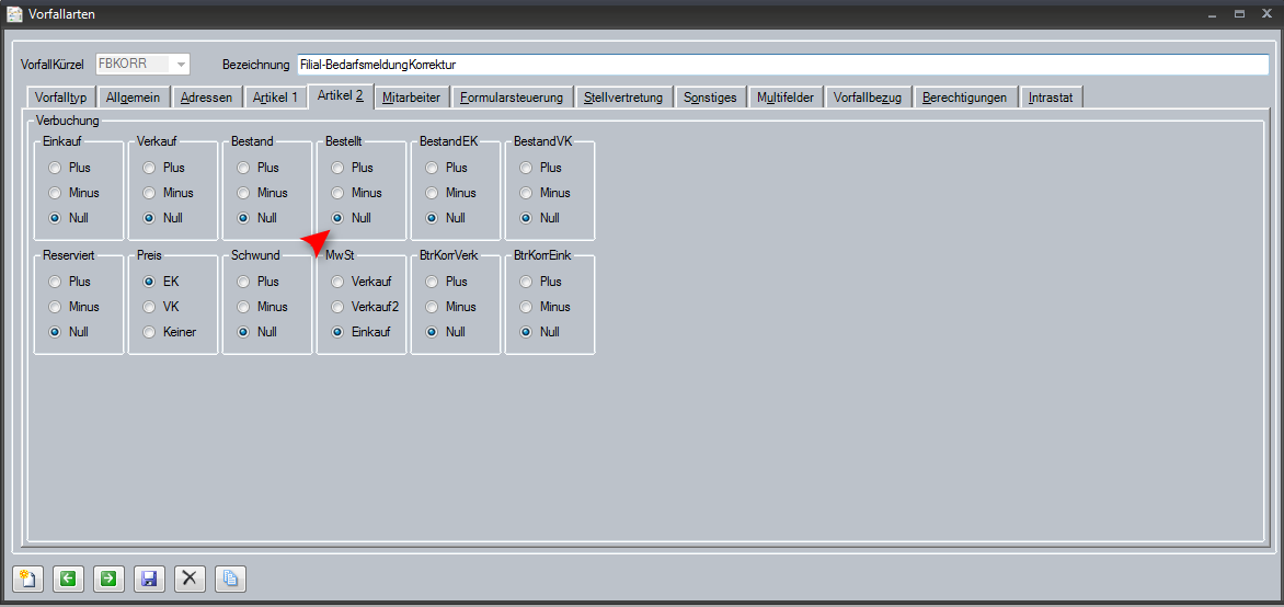 In Orgasoft.NET kann man die Bestands-Filialübersichtsfelder nur indirekt ändern, und zwar, für das Feld "reserv. für Filiale", sollte man unter geschäftsvorfallarten eine Vorfallart, in dem Fall Filial-Bedarfsmeldung FB, als Korrekturbuchung anlegen, also Filial-Bedarfsmeldungskorrektur (FBKORR) zum Beispiel. Wobei die Werte im Register Artikel 2 geändert werden müssen, bei „Bestellt“ den Punkt vom Plus in Null setzen.