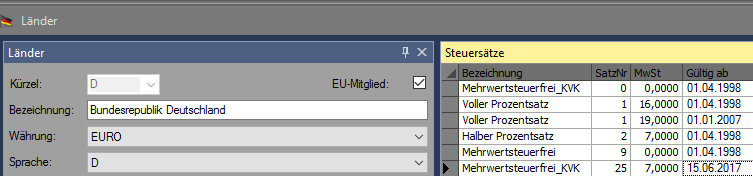 da die Steuersätze länderspezifisch sind, werden die Steuersätze unter Stammdaten-Konstanten-Länder angelegt.