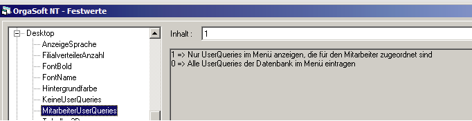 Der Festwert MitarbeiterUserQueries in der Rubrik Desktop regelt, ob alle oder nur die dem Mitarbeiter zugeordneten UserQueries angezeigt werden: