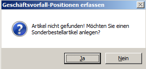 Sie geben eine nicht vorhandene Artikelnummer in der Erfassung an und es erfolgt die Rückfrage, ob Sie einen Sonderbestellartikel anlegen wollen: