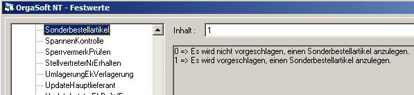 Sonderbestellartikel dienen dazu, dass Artikel "vorübergehend" angelegt werden können. So können Sie einen Artikel, den Sie vielleicht nur einmal bestellen, in ORGASOFTNT anlegen und problemlos wieder löschen, ohne dass dabei z.B. die Umsatzzahlen zu diesem Artikel verloren gehen würden.