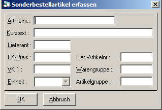 Sie können während der Eingabe von Geschäftsvorfällen SHIFT+F3 drücken, um einen neuen Sonderbestellartikel einzugeben. Der Artikel wird nur mit den nötigsten Informationen angelegt, Sie können ihn aber anschließend auch ganz normal im Artikelfenster wieder aufrufen, abändern und ggf. sogar zu einem "normalen" Artikel machen, indem Sie den Bestellstatus ändern: