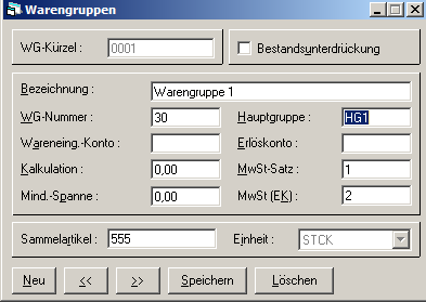 Zu jeder Warengruppe muss unter Stammdaten - Artikel - Warengruppen ein Sammelartikel definiert werden, der natürlich auch zu dieser Warengruppe gehören muss: