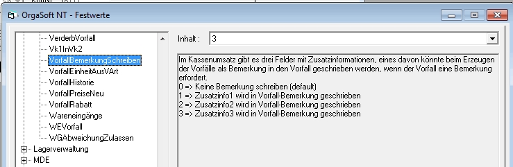 Was man aber jetzt ab Version 5.4.15 einrichten kann, man kann mit Hilfe einer UserPrePosBooking-Abfrage in der Datenbank die vorhandenen Informationen in die Felder Zusatzinfo 1-3 der Tabelle KassenUmsatz schreiben, und über den Festwert aus der Rubrik „Vorfälle“ den Inhalt dann den Positionsbemerkungen zuweisen. Somit hat man pro Position im Vorfall die Informationen wie BonNr, KassenNr, Verkäufer und/oder Kassierer, je nachdem, was die Kasse an Informationen liefert.