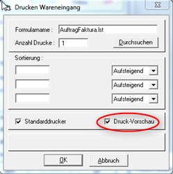Über den Flag Druck-Vorschau im nachfolgenen Fenster ist es möglich, für den aktuellen Druck die Druckvorschau ein- bzw. auszuschalten.