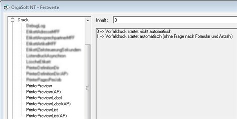 Startet der Druck direkt, ohne dass Sie o. g. Fenster ansprechen können, ist der Festwert Vorfälle/VorfallDruckAuto anzupassen und auf "0=Vorfalldruck startet nicht automatisch" zu stellen.