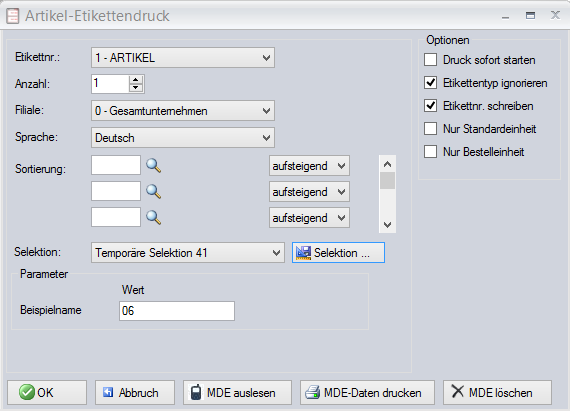 Wenn Sie beim Ausführen von Abfrage, oder z.B. beim Etikettendruck auf Selektionen zurückgreifen können, gibt es die Möglichkeit dabei immer automatisch nach einem Parameter abgefragt zu werden. Dieser Parameter kann in den Selektionen hinterlegt werden.