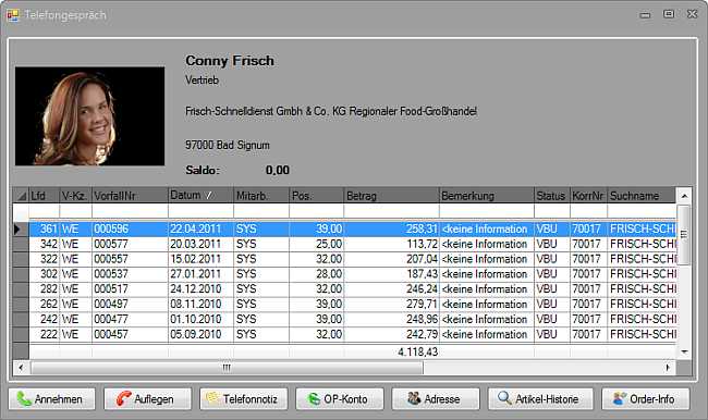 Bei eingehenden Gesprächen zeigt Ihnen die Tapi-Schnittstelle automatisch die letzten Vorgänge zu dem Anrufer und den aktuellen Saldo an. Sollte der Anrufer zum Beispiel am Tag seines Anrufs Geburtstag haben, so wird Ihnen dies zukünftig auch nicht mehr entgehen. Mit einem Mausklick erreichen Sie zusätzlich die wichtigsten Informationen zu dieser Adresse und können so alle Anfragen schnell und einfach bearbeiten.