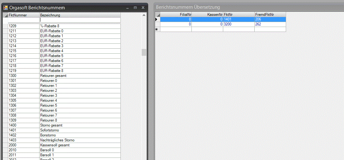 Eine zentrale Voraussetzung ist, was in alle Regel zusammen mit dem Kassenhändler erstellt wird, eine Übersetzungstabelle, um jeden zu speichernden Wert, der über sogenannte Funktionsnummern im Kassensystem verwaltet wird, den Orgasoft.NET Funktionsnummern zuzuweisen. Dies kann pro Kasse, pro Filiale oder für alle gleich definiert werden.