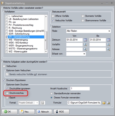 Anschließend wechseln Sie in das Modul Stapelverarbeitung ( Warenwirtschaft/Belege/Stapelverarbeitung) und drucken von hier aus ohne den Flag „Druckvorschau“.