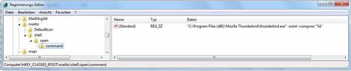 Im Regestry Bereich "HKEY_CLASSES_ROOT\mailto\shell\open\command" muss unter Daten der korrekte Pfad eingetragen werden in dem sich die Thunerbird.exe befindet.