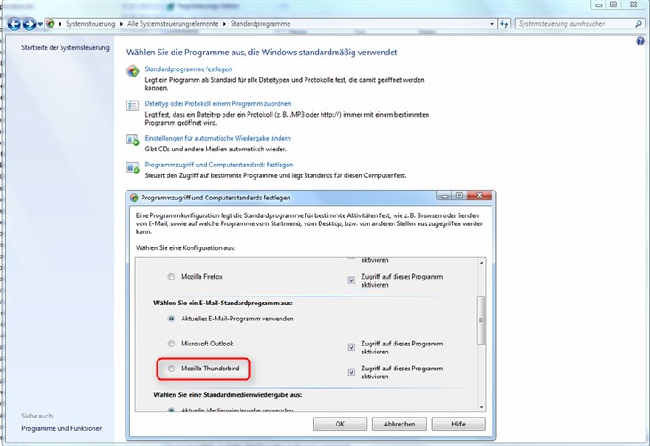 Des Weiteren über "Systemsteuerung/Standartprogramme/Programmzugriff und Compunterstandards festlegen" im Bereich "Benutzerdefiniert" setzten Sie den Flag bei "Mozilla Thunderbird".
