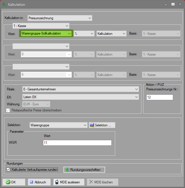 In der Kalkulation können Sie nun auch mit den in den Warengruppen hinterlegten Sollwerten Ihre Kalkulation durchführen lassen.