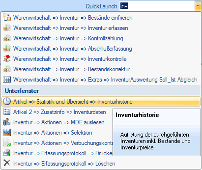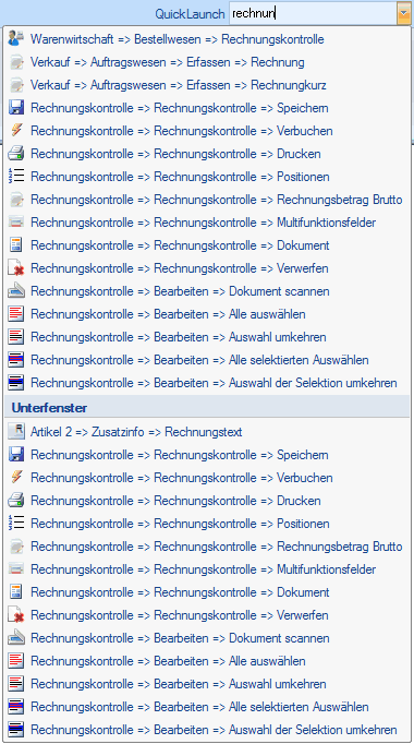 Mit QuickLaunch können Sie Funktionen Ihres Warenwirtschaftssystems schneller finden. Tippen Sie die ersten Buchstaben eines Features ein, zeigt Ihnen QuickLaunch passende Funktionen mit dem eingetippten Wort oder Wortteil an.