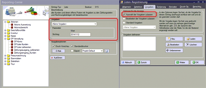 Gehen Sie zum Anpassen der Einstellung direkt über MIS/Reporting-Center und wählen die gewünschte OP-Liste aus, klicken auf den Button Bearbeiten oder über das Kontextmenü mit rechter Maustaste Bearbeiten auswählen. Im folgenden Fenster „Listen-Registrierung“ wählen Sie dann Reiter "Vorgaben" aus und setzten einen Haken bei "Auswahl der Vorgaben zulassen", speichern Sie jetzt diese Änderung. Nun sehen Sie im Reporting-Center, rechts der OP-Liste die Felder Vorgaben und Stichtag.