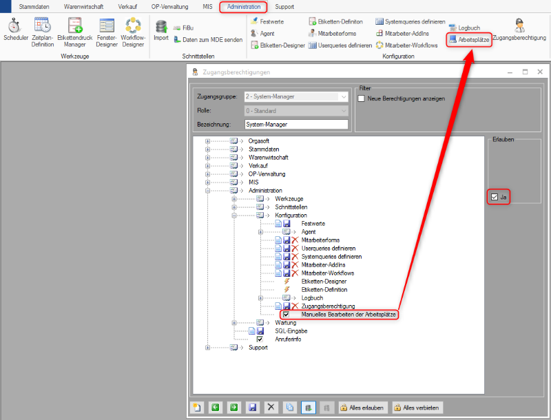 Ggf. müssen Sie diesen neuen Button erst über die Zugangsberechtigungen dem Systemadministrator erlauben, sollten Sie diese nicht in der Programm-Oberfläche sehen: