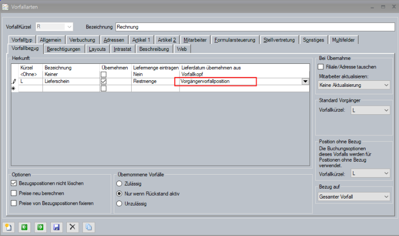 Andernfalls prüfen Sie bitte die Einstellungen all ihrer Vorfallarten vom Typ Rechnung und Gutschrift. Dort muss unter der Reiterkarte Vorfallbezug bei den Vorgängern, die das Leistungsdatum vorgeben, in der Spalte <Lieferdatum übernehmen aus> <Vorgängervorfallposition> ausgewählt werden!