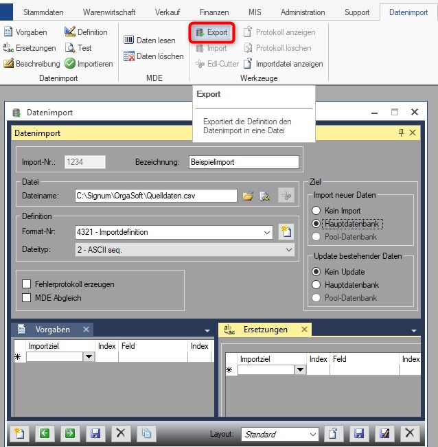 Zur Sicherung vor einer Anpassung oder zur Übertragung einer Importdefinition in eine weitere Orgasoft.NET installation, z. Bsp. in die Testumgebung oder für Supportanfragen, können die jeweiligen Importeinstellungen in eine Datei exportiert werden.