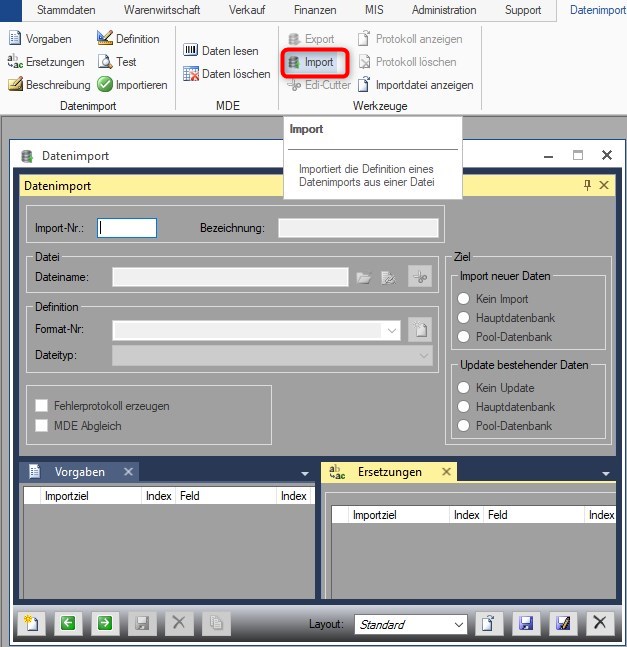 Um eine gesicherte Defnition zurückzuspielen klicken Sie bei leerem Importfenster auf Import und beachten die weiteren Dialoge