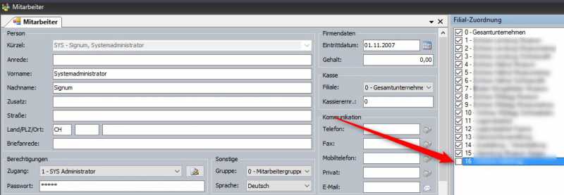 wenn eine neue Filiale angelegt wurde und mit dem Festwert Filialen->FilialMitarbeiter gearbeitet wird, dann muss die neue Filiale den Mitarbeitern noch zugeteilt werden.