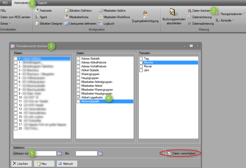 Administration-Daten löschen-Periodenwete löschen; Filiale(n) und Artikellagerkarte anhaken und einen Zeitraum eingeben.