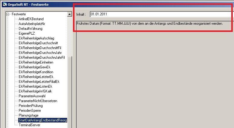 Bitte achten Sie darauf diesen Festwert am besten nach jedem erfolgreichen Durchlaufen der Reorganisation der Anfangs- und Endbestände entsprechend zu ändern. Die Reorganisation kann dadurch deutlich schneller ausgeführt werden.