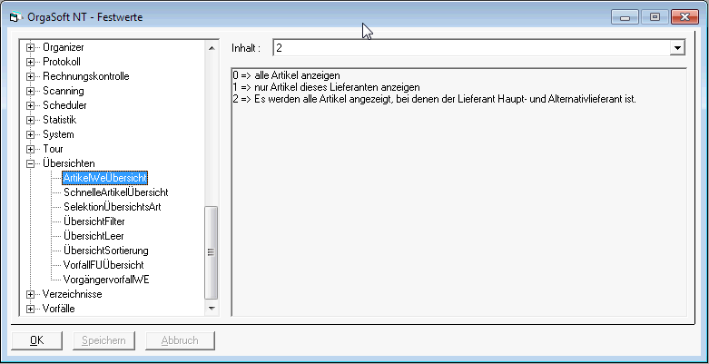 In den Festwerten gibt es unter Übersichten den Schalter "ArtikelWEÜbersicht", mit welchem definiert werden kann, welche Artikel bei einem Wareneingang in der Übersicht angezeigt werden: